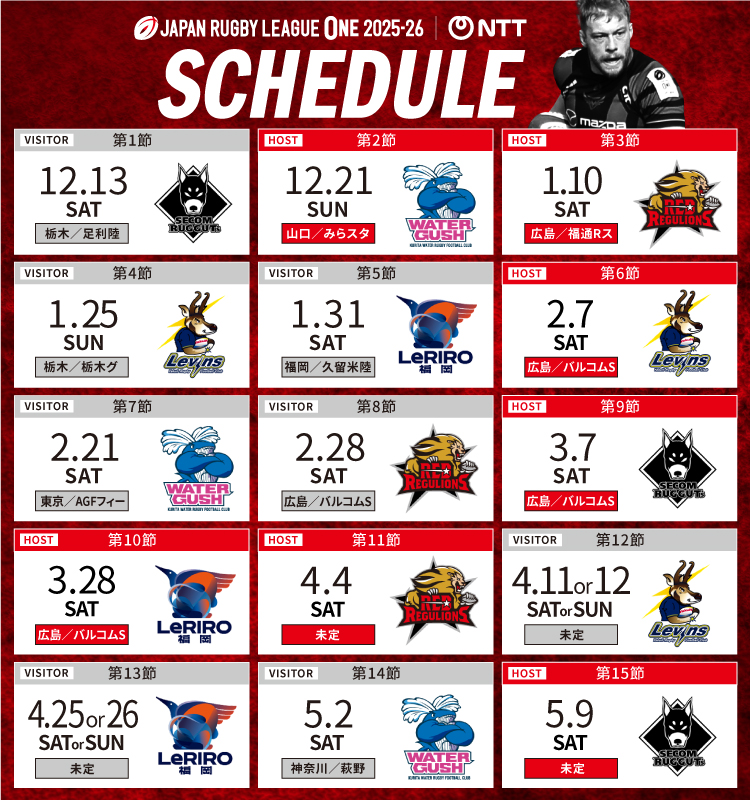 GAME INFORMATION JAPAN RUGBY LEAGUE ONE 2025-26 D3 第5節 ルリーロ福岡 17 - 40 WIN 福岡/久留米陸上競技場 スカイアクティブズ 広島 GAME INFORMATION JAPAN RUGBY LEAGUE ONE 2025-26 D3 第6節 スカイアクティブズ 広島 2.7SAT 13:00 広島/バルコムBMWスタジアム ヤクルトレビンス 戸田 PICK UP NEWS 2026.02.02[MON] GAME 【イベント情報】vsヤクルトレビンズ戸田 2026.01.29[THU] GAME <NTT JAPAN RUGBY LEAGUE ONE2025-26第4節 試合結果> 2026.01.29[THU] GAME 【メンバー発表】vsルリーロ福岡 2026.01.23[FRI] GAME 【メンバー発表】vsヤクルトレビンズ戸田 2026.01.22[THU] TEAM 2025-26シーズン新加入選手およびスタッフのお知らせ 2026.01.19[MON] ACTIVITY 広島サンダーズ合同応援に参加しました 2026.01.19[MON] GAME <NTT JAPAN RUGBY LEAGUE ONE2025-26第3節 試合結果> 2026.01.15[THU] ACTIVITY 草津保育園でラグビー体験会を実施しました 2026.01.15[THU] GAME 【メンバー発表】vs九州電力キューデンヴォルテクス 2026.01.14[WED] FAN CLUB 【重要なお知らせ】メールマガジンの配信について 2026.01.08[THU] GAME 【メンバー発表】vs中国電力レッドレグリオンズ 2026.01.05[MON] GAME トレーニングマッチのお知らせ 2025.12.26[FRI] GAME <NTT JAPAN RUGBY LEAGUE ONE2025-26第2節 試合結果> 2025.12.25[THU] ACTIVITY 広島ドラゴンフライズ合同応援に参加しました 2025.12.24[WED] GAME リーグワンホストゲーム1/10(土)「中国電力レッドレグリオンズ戦」のお知らせ 2025.12.19[FRI] GAME <NTT JAPAN RUGBY LEAGUE ONE2025-26開幕戦 試合結果> 2025.12.19[FRI] GAME 【メンバー発表】vsクリタウォーターガッシュ昭島 2025.12.16[TUE] TEAM 退団選手のお知らせ 2025.12.15[MON] GAME 【イベント情報】vsクリタウォーターガッシュ昭島 2025.12.14[SUN] ACTIVITY 「トラスポ!ひろしま」に参加しました 2025.12.12[FRI] ACTIVITY 広島市長を表敬訪問しました(2025年12月) 2025.12.11[THU] GAME 【メンバー発表】vs狭山セコムラガッツ 2025.12.11[THU] TEAM 2025-26シーズン キャプテン・リーダーおよびシーズンスローガンのお知らせ 2025.12.05[FRI] ACTIVITY 良城小学校でタグラグビー教室を実施しました 2025.12.05[FRI] ACTIVITY 特別支援学校でラグビー体験会を実施しました 2025.12.04[THU] TEAM 2025-26シーズン パートナー様との決起会を開催しました 2025.12.03[WED] ACTIVITY 「2025年 年末の全国交通安全運動」に参加しました 2025.12.02[TUE] ACTIVITY ゲーンス幼稚園でラグビー体験会を実施しました 2025.11.27[THU] GAME 【メンバー発表】vs九州電力キューデンヴォルテクス 2025.11.27[THU] TEAM 2025-26シーズンスタッフ新体制のお知らせ 2025.11.27[THU] ACTIVITY 落合東小学校でタグラグビー教室を実施しました 2025.11.24[MON] ACTIVITY 「ひろでんの日 2025」に参加しました 2025.11.24[MON] ACTIVITY セイラビリティ広島あびの会ハンザ練習会に参加しました 2025.11.24[MON] ACTIVITY 「ヒューマンフェスタ2025in府中町・第28回スマイル21」に参加しました 2025.11.18[TUE] ACTIVITY 「広島東南ロータリークラブ」にて講演を実施しました 2025.11.17[MON] ACTIVITY 「コムズ安佐パーク秋祭り」に参加しました 2025.11.17[MON] ACTIVITY 「ワイテックオープンデー」に参加しました 2025.11.14[FRI] ACTIVITY 庚午小学校でタグラグビー教室を実施しました 2025.11.13[THU] GAME 【メンバー発表】vsルリーロ福岡 2025.11.10[MON] ACTIVITY 「キーレックスファミリーデー」に参加しました 2025.11.09[SUN] ACTIVITY 金江小学校でタグラグビー教室を実施しました 2025.11.06[THU] GAME 【メンバー発表】vsコベルコ神戸スティーラーズ 2025.11.02[SUN] ACTIVITY 西区ゆかりのスポーツチーム交流会に参加しました 2025.11.02[SUN] ACTIVITY 横川ゾンビナイトに参加しました 2025.11.02[SUN] ACTIVITY 福山大学三蔵祭に参加しました 2025.11.02[SUN] ACTIVITY アイグラン保育園古江でラグビー体験会を実施しました 2025.11.02[SUN] ACTIVITY 第30回愛情防府フリーマーケットに参加しました 2025.10.14[TUE] ACTIVITY Fine Days ~心と体を整える、美と健康のファミリーフェス~ に参加しました 2025.10.09[THU] GAME 【メンバー発表】VSホンコン・チャイナ代表 2025.10.04[SAT] ACTIVITY 「黒瀬児童館まつり」に参加しました 2025.10.03[FRI] ACTIVITY 2025年全国秋の交通安全運動に参加しました(交通事故死ゼロを目指す日) 2025.10.02[THU] ACTIVITY 2025年全国秋の交通安全運動に参加しました(「レモンチ交通安全フェスタ2025」) 2025.10.02[THU] GAME 【メンバー発表】vs花園近鉄ライナーズ 2025.10.01[WED] FAN CLUB 2025-26シーズン ファンクラブ会員募集開始のお知らせ 2025.09.30[TUE] GAME 2025 プレシーズンマッチ スケジュールのお知らせ 2025.09.29[MON] ACTIVITY 「JR新井口駅 花のパネル除幕式」に出席しました 2025.09.27[SAT] ACTIVITY 2025年全国秋の交通安全運動に参加しました(交差点サポート) 2025.09.27[SAT] ACTIVITY 福山工業高校、福山誠之館高校でラグビークリニックを実施しました 2025.09.27[SAT] ACTIVITY 「たられば防祭」に参加しました 2025.09.26[FRI] GAME 【メンバー発表】vs中国電力レッドレグリオンズ 2025.09.22[MON] ACTIVITY 「ふちゅうスポーツフェスタ2025」に参加しました 2025.09.13[SAT] ACTIVITY 春日東小学校タグラグビー教室を実施しました 2025.09.11[THU] TEAM スタッフ活動情報(貝塚アシスタントトレーナー) 2025.09.07[SUN] ACTIVITY YAMAGUCHIジュ