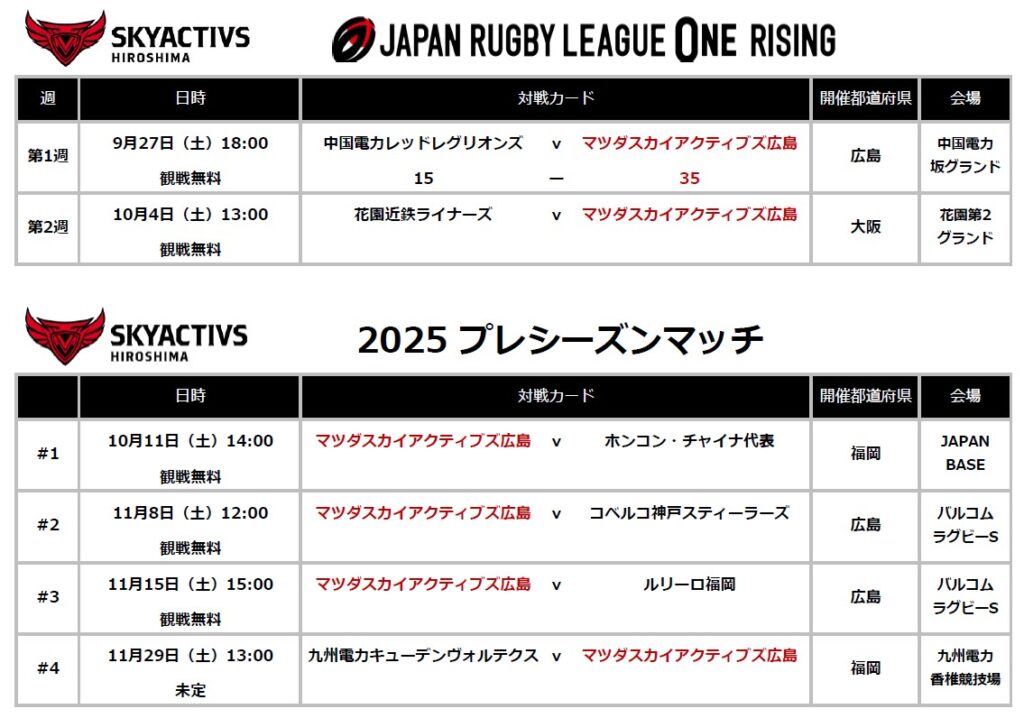 ■2025 プレシーズンマッチスケジュール(ジャパンラグビーリーグワンライジング2025含む)